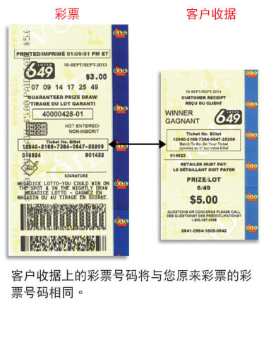 - 收据上的彩票号码(在方框内)应与彩票上的彩票号码(Ticket Number)相同。